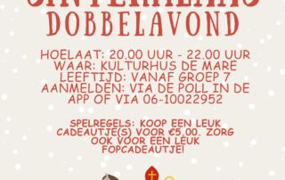 ✨🎲Op vrijdag 12 december organiseren we een supergezellige dobbelavond voor iedereen vanaf groep 7 in Kulturhus De Mare! Een gezellige dobbelavond vol lol, verrassingen en natuurlijk… pakjes!✨🎲 🕗 Tijd: 20.00 – 22.00 uur📍 Locatie: Kulturhus De Mare [...]